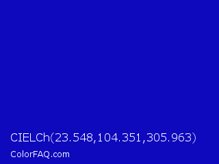 CIELCh 23.548,104.351,305.963 Color is a normal indigo color and the nearest color is Dark Blue #0000c8. Hex code #0e09bd and RGB value is rgb(14,9,189). In RGB color space, this color is composed of 5% red, 4% green, 74% blue, In CMYK color space, this color is composed of 93% cyan, 95% magenta, 0% yellow , 26% black , In HSL color space, this color has a hue angle of 242° , 91% saturation and 39% lightness.