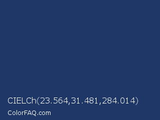 CIELCh 23.564,31.481,284.014 Color is a dark blue color and the nearest color is Biscay #1b3162. Hex code #1e3766 and RGB value is rgb(30,55,102). In RGB color space, this color is composed of 12% red, 22% green, 40% blue, In CMYK color space, this color is composed of 71% cyan, 46% magenta, 0% yellow , 60% black , In HSL color space, this color has a hue angle of 219° , 55% saturation and 26% lightness.
