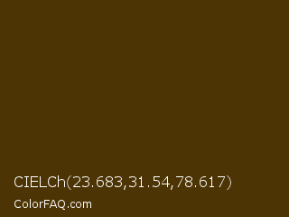 CIELCh 23.683,31.54,78.617 Color is a very dark orange color and the nearest color is Deep Bronze #4a3004. Hex code #4c3405 and RGB value is rgb(76,52,5). In RGB color space, this color is composed of 30% red, 20% green, 2% blue, In CMYK color space, this color is composed of 0% cyan, 32% magenta, 93% yellow , 70% black , In HSL color space, this color has a hue angle of 40° , 88% saturation and 16% lightness.