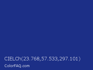 CIELCh 23.768,57.533,297.101 Color is a normal blue color and the nearest color is St Patricks Blue #23297a. Hex code #1c2f87 and RGB value is rgb(28,47,135). In RGB color space, this color is composed of 11% red, 18% green, 53% blue, In CMYK color space, this color is composed of 79% cyan, 65% magenta, 0% yellow , 47% black , In HSL color space, this color has a hue angle of 229° , 66% saturation and 32% lightness.