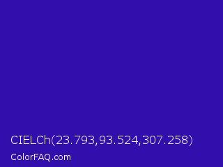 CIELCh 23.793,93.524,307.258 Color is a normal indigo color and the nearest color is Interdimensional Blue #360ccc. Hex code #320fad and RGB value is rgb(50,15,173). In RGB color space, this color is composed of 20% red, 6% green, 68% blue, In CMYK color space, this color is composed of 71% cyan, 91% magenta, 0% yellow , 32% black , In HSL color space, this color has a hue angle of 253° , 84% saturation and 37% lightness.