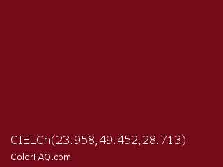 CIELCh 23.958,49.452,28.713 Color is a dark red color and the nearest color is UP Maroon #7b1113. Hex code #750b18 and RGB value is rgb(117,11,24). In RGB color space, this color is composed of 46% red, 4% green, 9% blue, In CMYK color space, this color is composed of 0% cyan, 91% magenta, 79% yellow , 54% black , In HSL color space, this color has a hue angle of 353° , 83% saturation and 25% lightness.