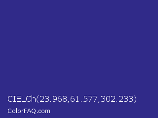CIELCh 23.968,61.577,302.233 Color is a normal indigo color and the nearest color is Cosmic Cobalt #2e2d88. Hex code #302a89 and RGB value is rgb(48,42,137). In RGB color space, this color is composed of 19% red, 16% green, 54% blue, In CMYK color space, this color is composed of 65% cyan, 69% magenta, 0% yellow , 46% black , In HSL color space, this color has a hue angle of 244° , 53% saturation and 35% lightness.