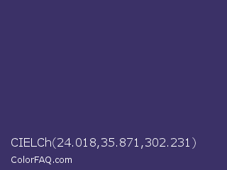 CIELCh 24.018,35.871,302.231 Color is a dark indigo color and the nearest color is Jacarta #3a2a6a. Hex code #3b3167 and RGB value is rgb(59,49,103). In RGB color space, this color is composed of 23% red, 19% green, 40% blue, In CMYK color space, this color is composed of 43% cyan, 52% magenta, 0% yellow , 60% black , In HSL color space, this color has a hue angle of 251° , 36% saturation and 30% lightness.