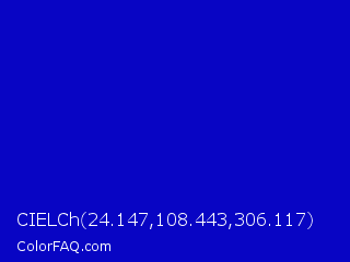 CIELCh 24.147,108.443,306.117 Color is a normal indigo color and the nearest color is Dark Blue #0000c8. Hex code #0805c4 and RGB value is rgb(8,5,196). In RGB color space, this color is composed of 3% red, 2% green, 77% blue, In CMYK color space, this color is composed of 96% cyan, 97% magenta, 0% yellow , 23% black , In HSL color space, this color has a hue angle of 241° , 95% saturation and 39% lightness.