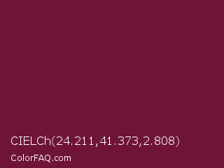 CIELCh 24.211,41.373,2.808 Color is a dark rose color and the nearest color is Claret #7f1734. Hex code #6f1438 and RGB value is rgb(111,20,56). In RGB color space, this color is composed of 44% red, 8% green, 22% blue, In CMYK color space, this color is composed of 0% cyan, 82% magenta, 50% yellow , 56% black , In HSL color space, this color has a hue angle of 336° , 69% saturation and 26% lightness.