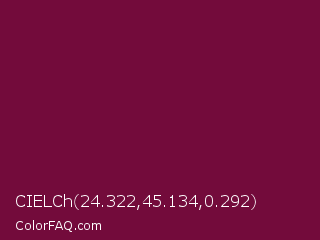 CIELCh 24.322,45.134,0.292 Color is a dark rose color and the nearest color is Siren #7a013a. Hex code #730b3b and RGB value is rgb(115,11,59). In RGB color space, this color is composed of 45% red, 4% green, 23% blue, In CMYK color space, this color is composed of 0% cyan, 90% magenta, 49% yellow , 55% black , In HSL color space, this color has a hue angle of 332° , 83% saturation and 25% lightness.