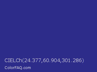 CIELCh 24.377,60.904,301.286 Color is a normal indigo color and the nearest color is Cosmic Cobalt #2e2d88. Hex code #2e2c8a and RGB value is rgb(46,44,138). In RGB color space, this color is composed of 18% red, 17% green, 54% blue, In CMYK color space, this color is composed of 67% cyan, 68% magenta, 0% yellow , 46% black , In HSL color space, this color has a hue angle of 241° , 52% saturation and 36% lightness.