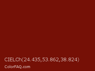 CIELCh 24.435,53.862,38.824 Color is a dark red color and the nearest color is Dark Burgundy #770f05. Hex code #761006 and RGB value is rgb(118,16,6). In RGB color space, this color is composed of 46% red, 6% green, 2% blue, In CMYK color space, this color is composed of 0% cyan, 86% magenta, 95% yellow , 54% black , In HSL color space, this color has a hue angle of 5° , 90% saturation and 24% lightness.