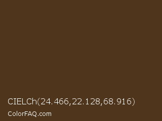 CIELCh 24.466,22.128,68.916 Color is a very dark orange color and the nearest color is Metallic Bronze #49371b. Hex code #4e351b and RGB value is rgb(78,53,27). In RGB color space, this color is composed of 31% red, 21% green, 11% blue, In CMYK color space, this color is composed of 0% cyan, 32% magenta, 65% yellow , 69% black , In HSL color space, this color has a hue angle of 31° , 49% saturation and 21% lightness.