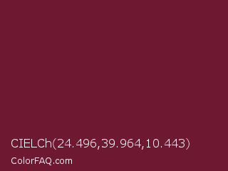 CIELCh 24.496,39.964,10.443 Color is a dark rose color and the nearest color is Claret #7f1734. Hex code #6f1831 and RGB value is rgb(111,24,49). In RGB color space, this color is composed of 44% red, 9% green, 19% blue, In CMYK color space, this color is composed of 0% cyan, 78% magenta, 56% yellow , 56% black , In HSL color space, this color has a hue angle of 343° , 64% saturation and 26% lightness.