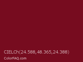 CIELCh 24.588,48.365,24.388 Color is a dark red color and the nearest color is UP Maroon #7b1113. Hex code #770c1f and RGB value is rgb(119,12,31). In RGB color space, this color is composed of 47% red, 5% green, 12% blue, In CMYK color space, this color is composed of 0% cyan, 90% magenta, 74% yellow , 53% black , In HSL color space, this color has a hue angle of 349° , 82% saturation and 26% lightness.