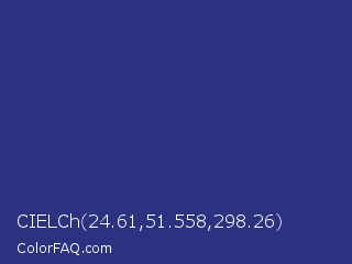 CIELCh 24.61,51.558,298.26 Color is a normal blue color and the nearest color is Cosmic Cobalt #2e2d88. Hex code #2c3180 and RGB value is rgb(44,49,128). In RGB color space, this color is composed of 17% red, 19% green, 50% blue, In CMYK color space, this color is composed of 66% cyan, 62% magenta, 0% yellow , 50% black , In HSL color space, this color has a hue angle of 236° , 49% saturation and 34% lightness.