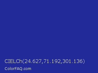 CIELCh 24.627,71.192,301.136 Color is a normal blue color and the nearest color is Jacksons Purple #20208d. Hex code #222a99 and RGB value is rgb(34,42,153). In RGB color space, this color is composed of 13% red, 16% green, 60% blue, In CMYK color space, this color is composed of 78% cyan, 73% magenta, 0% yellow , 40% black , In HSL color space, this color has a hue angle of 236° , 64% saturation and 37% lightness.