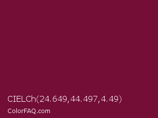 CIELCh 24.649,44.497,4.49 Color is a dark rose color and the nearest color is Claret #7f1734. Hex code #740e37 and RGB value is rgb(116,14,55). In RGB color space, this color is composed of 45% red, 5% green, 22% blue, In CMYK color space, this color is composed of 0% cyan, 88% magenta, 53% yellow , 55% black , In HSL color space, this color has a hue angle of 336° , 78% saturation and 25% lightness.