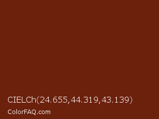 CIELCh 24.655,44.319,43.139 Color is a dark red color and the nearest color is Moccaccino #6e1d14. Hex code #6c210d and RGB value is rgb(108,33,13). In RGB color space, this color is composed of 42% red, 13% green, 5% blue, In CMYK color space, this color is composed of 0% cyan, 69% magenta, 88% yellow , 58% black , In HSL color space, this color has a hue angle of 13° , 79% saturation and 24% lightness.