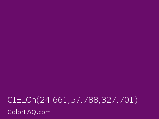 CIELCh 24.661,57.788,327.701 Color is a dark magenta color and the nearest color is Midnight #702670. Hex code #690c6a and RGB value is rgb(105,12,106). In RGB color space, this color is composed of 41% red, 5% green, 42% blue, In CMYK color space, this color is composed of 1% cyan, 89% magenta, 0% yellow , 58% black , In HSL color space, this color has a hue angle of 299° , 80% saturation and 23% lightness.