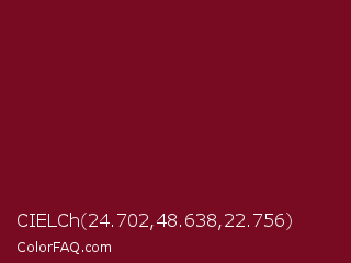 CIELCh 24.702,48.638,22.756 Color is a dark red color and the nearest color is Burgundy #800020. Hex code #780a21 and RGB value is rgb(120,10,33). In RGB color space, this color is composed of 47% red, 4% green, 13% blue, In CMYK color space, this color is composed of 0% cyan, 92% magenta, 73% yellow , 53% black , In HSL color space, this color has a hue angle of 347° , 85% saturation and 25% lightness.