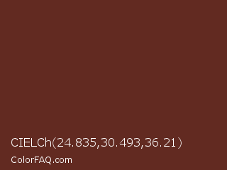 CIELCh 24.835,30.493,36.21 Color is a dark red color and the nearest color is Espresso #612718. Hex code #622a21 and RGB value is rgb(98,42,33). In RGB color space, this color is composed of 38% red, 16% green, 13% blue, In CMYK color space, this color is composed of 0% cyan, 57% magenta, 66% yellow , 62% black , In HSL color space, this color has a hue angle of 8° , 50% saturation and 26% lightness.