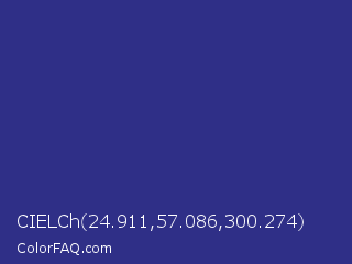 CIELCh 24.911,57.086,300.274 Color is a normal blue color and the nearest color is Cosmic Cobalt #2e2d88. Hex code #2f2f87 and RGB value is rgb(47,47,135). In RGB color space, this color is composed of 18% red, 18% green, 53% blue, In CMYK color space, this color is composed of 65% cyan, 65% magenta, 0% yellow , 47% black , In HSL color space, this color has a hue angle of 240° , 48% saturation and 36% lightness.