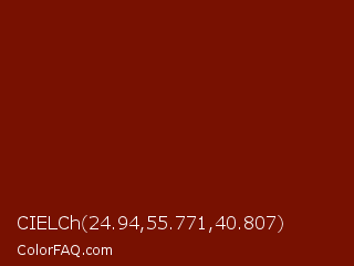 CIELCh 24.94,55.771,40.807 Color is a dark red color and the nearest color is Dark Burgundy #770f05. Hex code #781101 and RGB value is rgb(120,17,1). In RGB color space, this color is composed of 47% red, 7% green, 0% blue, In CMYK color space, this color is composed of 0% cyan, 86% magenta, 99% yellow , 53% black , In HSL color space, this color has a hue angle of 8° , 98% saturation and 24% lightness.