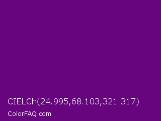 CIELCh 24.995,68.103,321.317 Color is a dark purple color and the nearest color is Patriarch #800080. Hex code #66057d and RGB value is rgb(102,5,125). In RGB color space, this color is composed of 40% red, 2% green, 49% blue, In CMYK color space, this color is composed of 18% cyan, 96% magenta, 0% yellow , 51% black , In HSL color space, this color has a hue angle of 289° , 92% saturation and 25% lightness.