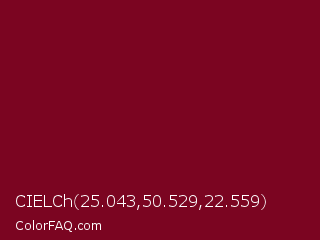 CIELCh 25.043,50.529,22.559 Color is a dark red color and the nearest color is Burgundy #800020. Hex code #7b0521 and RGB value is rgb(123,5,33). In RGB color space, this color is composed of 48% red, 2% green, 13% blue, In CMYK color space, this color is composed of 0% cyan, 96% magenta, 73% yellow , 52% black , In HSL color space, this color has a hue angle of 346° , 92% saturation and 25% lightness.