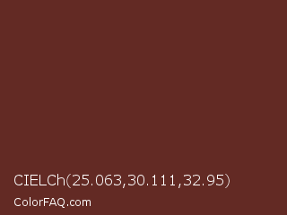 CIELCh 25.063,30.111,32.95 Color is a dark red color and the nearest color is Liver Organ #6c2e1f. Hex code #632a24 and RGB value is rgb(99,42,36). In RGB color space, this color is composed of 39% red, 16% green, 14% blue, In CMYK color space, this color is composed of 0% cyan, 58% magenta, 64% yellow , 61% black , In HSL color space, this color has a hue angle of 6° , 47% saturation and 26% lightness.