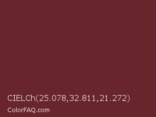 CIELCh 25.078,32.811,21.272 Color is a dark red color and the nearest color is Buccaneer #622f30. Hex code #68252b and RGB value is rgb(104,37,43). In RGB color space, this color is composed of 41% red, 15% green, 17% blue, In CMYK color space, this color is composed of 0% cyan, 64% magenta, 59% yellow , 59% black , In HSL color space, this color has a hue angle of 355° , 48% saturation and 28% lightness.
