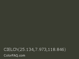 CIELCh 25.134,7.973,118.846 Color is a very dark lime color and the nearest color is Black Olive #3b3c36. Hex code #3a3d31 and RGB value is rgb(58,61,49). In RGB color space, this color is composed of 23% red, 24% green, 19% blue, In CMYK color space, this color is composed of 5% cyan, 0% magenta, 20% yellow , 76% black , In HSL color space, this color has a hue angle of 75° , 11% saturation and 22% lightness.