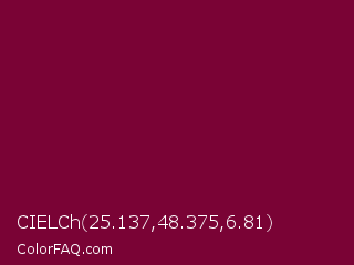 CIELCh 25.137,48.375,6.81 Color is a dark rose color and the nearest color is Siren #7a013a. Hex code #7a0335 and RGB value is rgb(122,3,53). In RGB color space, this color is composed of 48% red, 1% green, 21% blue, In CMYK color space, this color is composed of 0% cyan, 98% magenta, 57% yellow , 52% black , In HSL color space, this color has a hue angle of 335° , 95% saturation and 25% lightness.