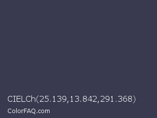 CIELCh 25.139,13.842,291.368 Color is a dark blue color and the nearest color is Bright Gray #3c4151. Hex code #393a4f and RGB value is rgb(57,58,79). In RGB color space, this color is composed of 22% red, 23% green, 31% blue, In CMYK color space, this color is composed of 28% cyan, 27% magenta, 0% yellow , 69% black , In HSL color space, this color has a hue angle of 237° , 16% saturation and 27% lightness.