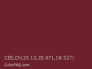 CIELCh 25.13,35.971,18.527 Color is a dark red color and the nearest color is Crown Of Thorns #771f1f. Hex code #6c212c and RGB value is rgb(108,33,44). In RGB color space, this color is composed of 42% red, 13% green, 17% blue, In CMYK color space, this color is composed of 0% cyan, 69% magenta, 59% yellow , 58% black , In HSL color space, this color has a hue angle of 351° , 53% saturation and 28% lightness.
