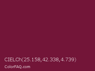 CIELCh 25.158,42.338,4.739 Color is a dark rose color and the nearest color is Claret #7f1734. Hex code #731538 and RGB value is rgb(115,21,56). In RGB color space, this color is composed of 45% red, 8% green, 22% blue, In CMYK color space, this color is composed of 0% cyan, 82% magenta, 51% yellow , 55% black , In HSL color space, this color has a hue angle of 338° , 69% saturation and 27% lightness.