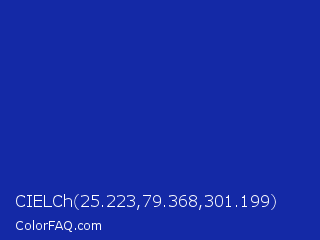 CIELCh 25.223,79.368,301.199 Color is a normal blue color and the nearest color is Torea Bay #0f2d9e. Hex code #1429a6 and RGB value is rgb(20,41,166). In RGB color space, this color is composed of 8% red, 16% green, 65% blue, In CMYK color space, this color is composed of 88% cyan, 75% magenta, 0% yellow , 35% black , In HSL color space, this color has a hue angle of 231° , 78% saturation and 36% lightness.