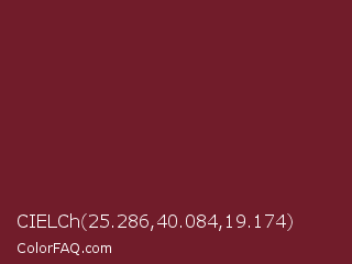 CIELCh 25.286,40.084,19.174 Color is a dark red color and the nearest color is Crown Of Thorns #771f1f. Hex code #711c2a and RGB value is rgb(113,28,42). In RGB color space, this color is composed of 44% red, 11% green, 16% blue, In CMYK color space, this color is composed of 0% cyan, 75% magenta, 63% yellow , 56% black , In HSL color space, this color has a hue angle of 350° , 60% saturation and 28% lightness.