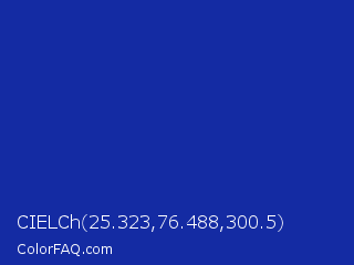 CIELCh 25.323,76.488,300.5 Color is a normal blue color and the nearest color is Torea Bay #0f2d9e. Hex code #142ba3 and RGB value is rgb(20,43,163). In RGB color space, this color is composed of 8% red, 17% green, 64% blue, In CMYK color space, this color is composed of 88% cyan, 74% magenta, 0% yellow , 36% black , In HSL color space, this color has a hue angle of 230° , 78% saturation and 36% lightness.