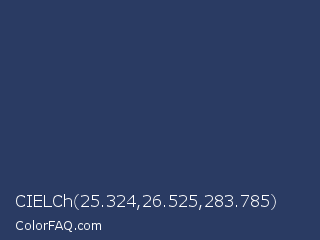 CIELCh 25.324,26.525,283.785 Color is a dark blue color and the nearest color is Rhino #2e3f62. Hex code #2a3b63 and RGB value is rgb(42,59,99). In RGB color space, this color is composed of 16% red, 23% green, 39% blue, In CMYK color space, this color is composed of 58% cyan, 40% magenta, 0% yellow , 61% black , In HSL color space, this color has a hue angle of 222° , 40% saturation and 28% lightness.