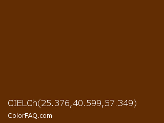 CIELCh 25.376,40.599,57.349 Color is a very dark orange color and the nearest color is Carnaby Tan #5c2e01. Hex code #632d04 and RGB value is rgb(99,45,4). In RGB color space, this color is composed of 39% red, 18% green, 2% blue, In CMYK color space, this color is composed of 0% cyan, 55% magenta, 96% yellow , 61% black , In HSL color space, this color has a hue angle of 26° , 92% saturation and 20% lightness.