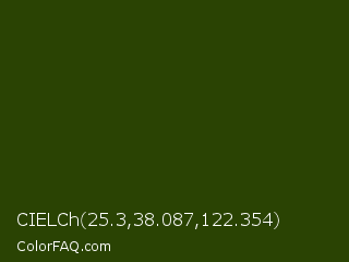 CIELCh 25.3,38.087,122.354 Color is a very dark green color and the nearest color is Turtle Green #2a380b. Hex code #2a4303 and RGB value is rgb(42,67,3). In RGB color space, this color is composed of 16% red, 26% green, 1% blue, In CMYK color space, this color is composed of 37% cyan, 0% magenta, 96% yellow , 74% black , In HSL color space, this color has a hue angle of 83° , 91% saturation and 14% lightness.