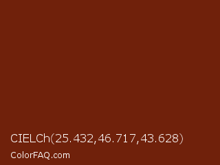 CIELCh 25.432,46.717,43.628 Color is a dark red color and the nearest color is Moccaccino #6e1d14. Hex code #70210b and RGB value is rgb(112,33,11). In RGB color space, this color is composed of 44% red, 13% green, 4% blue, In CMYK color space, this color is composed of 0% cyan, 71% magenta, 90% yellow , 56% black , In HSL color space, this color has a hue angle of 13° , 82% saturation and 24% lightness.