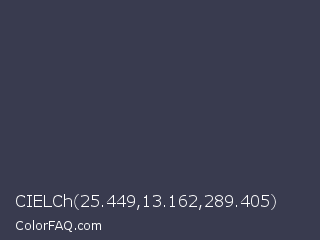 CIELCh 25.449,13.162,289.405 Color is a dark blue color and the nearest color is Bright Gray #3c4151. Hex code #393b4f and RGB value is rgb(57,59,79). In RGB color space, this color is composed of 22% red, 23% green, 31% blue, In CMYK color space, this color is composed of 28% cyan, 25% magenta, 0% yellow , 69% black , In HSL color space, this color has a hue angle of 235° , 16% saturation and 27% lightness.