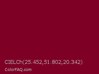 CIELCh 25.452,51.802,20.342 Color is a dark rose color and the nearest color is Burgundy #800020. Hex code #7e0024 and RGB value is rgb(126,0,36). In RGB color space, this color is composed of 49% red, 0% green, 14% blue, In CMYK color space, this color is composed of 0% cyan, 100% magenta, 71% yellow , 51% black , In HSL color space, this color has a hue angle of 343° , 100% saturation and 25% lightness.