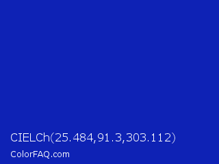 CIELCh 25.484,91.3,303.112 Color is a normal blue color and the nearest color is Blue Pantone #0018a8. Hex code #0e22b5 and RGB value is rgb(14,34,181). In RGB color space, this color is composed of 5% red, 13% green, 71% blue, In CMYK color space, this color is composed of 92% cyan, 81% magenta, 0% yellow , 29% black , In HSL color space, this color has a hue angle of 233° , 86% saturation and 38% lightness.