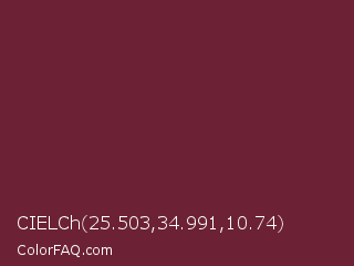 CIELCh 25.503,34.991,10.74 Color is a dark red color and the nearest color is Wine #722f37. Hex code #6c2234 and RGB value is rgb(108,34,52). In RGB color space, this color is composed of 42% red, 13% green, 20% blue, In CMYK color space, this color is composed of 0% cyan, 69% magenta, 52% yellow , 58% black , In HSL color space, this color has a hue angle of 345° , 52% saturation and 28% lightness.