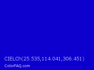 CIELCh 25.535,114.041,306.451 Color is a normal indigo color and the nearest color is Medium Blue #0000cd. Hex code #0d00cf and RGB value is rgb(13,0,207). In RGB color space, this color is composed of 5% red, 0% green, 81% blue, In CMYK color space, this color is composed of 94% cyan, 100% magenta, 0% yellow , 19% black , In HSL color space, this color has a hue angle of 244° , 100% saturation and 41% lightness.