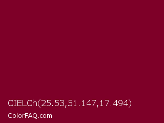 CIELCh 25.53,51.147,17.494 Color is a dark rose color and the nearest color is Burgundy #800020. Hex code #7e0028 and RGB value is rgb(126,0,40). In RGB color space, this color is composed of 49% red, 0% green, 16% blue, In CMYK color space, this color is composed of 0% cyan, 100% magenta, 68% yellow , 51% black , In HSL color space, this color has a hue angle of 341° , 100% saturation and 25% lightness.