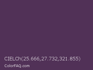 CIELCh 25.666,27.732,321.855 Color is a dark purple color and the nearest color is Voodoo #533455. Hex code #513157 and RGB value is rgb(81,49,87). In RGB color space, this color is composed of 32% red, 19% green, 34% blue, In CMYK color space, this color is composed of 7% cyan, 44% magenta, 0% yellow , 66% black , In HSL color space, this color has a hue angle of 291° , 28% saturation and 27% lightness.