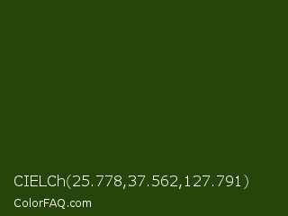 CIELCh 25.778,37.562,127.791 Color is a very dark green color and the nearest color is Green House #24500f. Hex code #25450a and RGB value is rgb(37,69,10). In RGB color space, this color is composed of 15% red, 27% green, 4% blue, In CMYK color space, this color is composed of 46% cyan, 0% magenta, 86% yellow , 73% black , In HSL color space, this color has a hue angle of 93° , 75% saturation and 15% lightness.