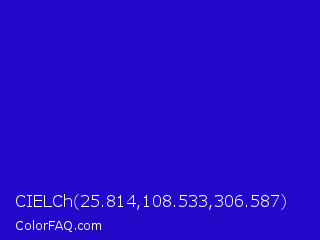 CIELCh 25.814,108.533,306.587 Color is a normal indigo color and the nearest color is Interdimensional Blue #360ccc. Hex code #2208c8 and RGB value is rgb(34,8,200). In RGB color space, this color is composed of 13% red, 3% green, 78% blue, In CMYK color space, this color is composed of 83% cyan, 96% magenta, 0% yellow , 22% black , In HSL color space, this color has a hue angle of 248° , 92% saturation and 41% lightness.